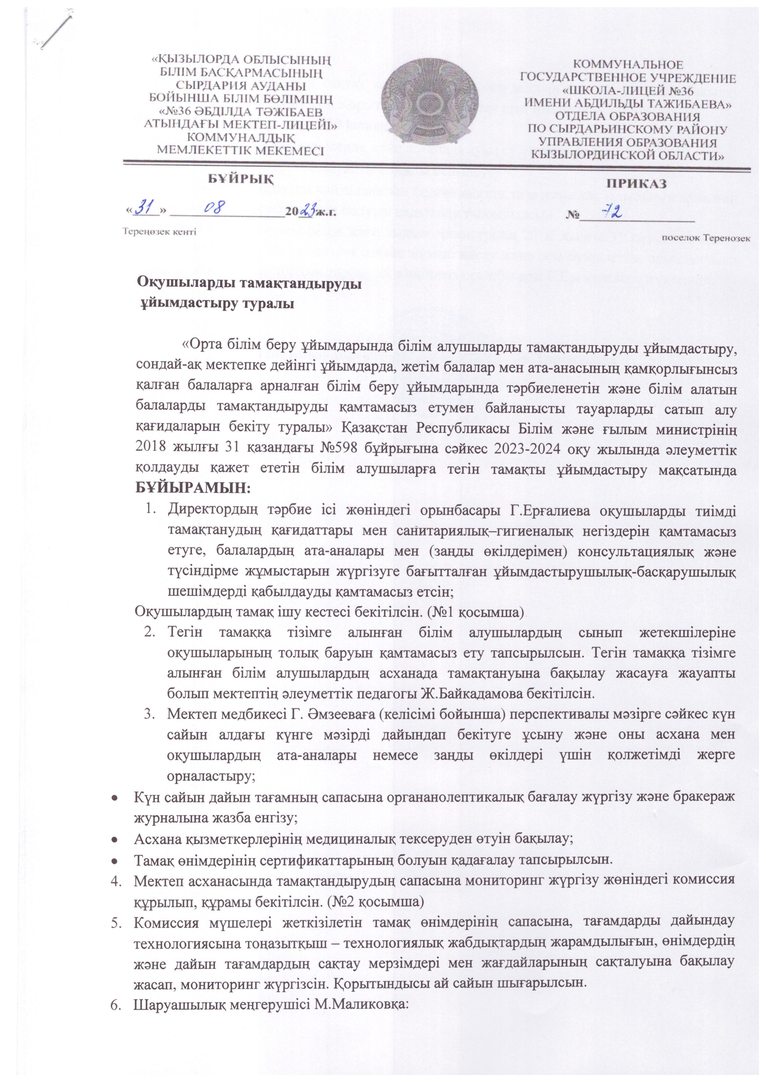 Оқушыларды тамақтандыруды ұйымдастыру » №36 мектеп-лицей