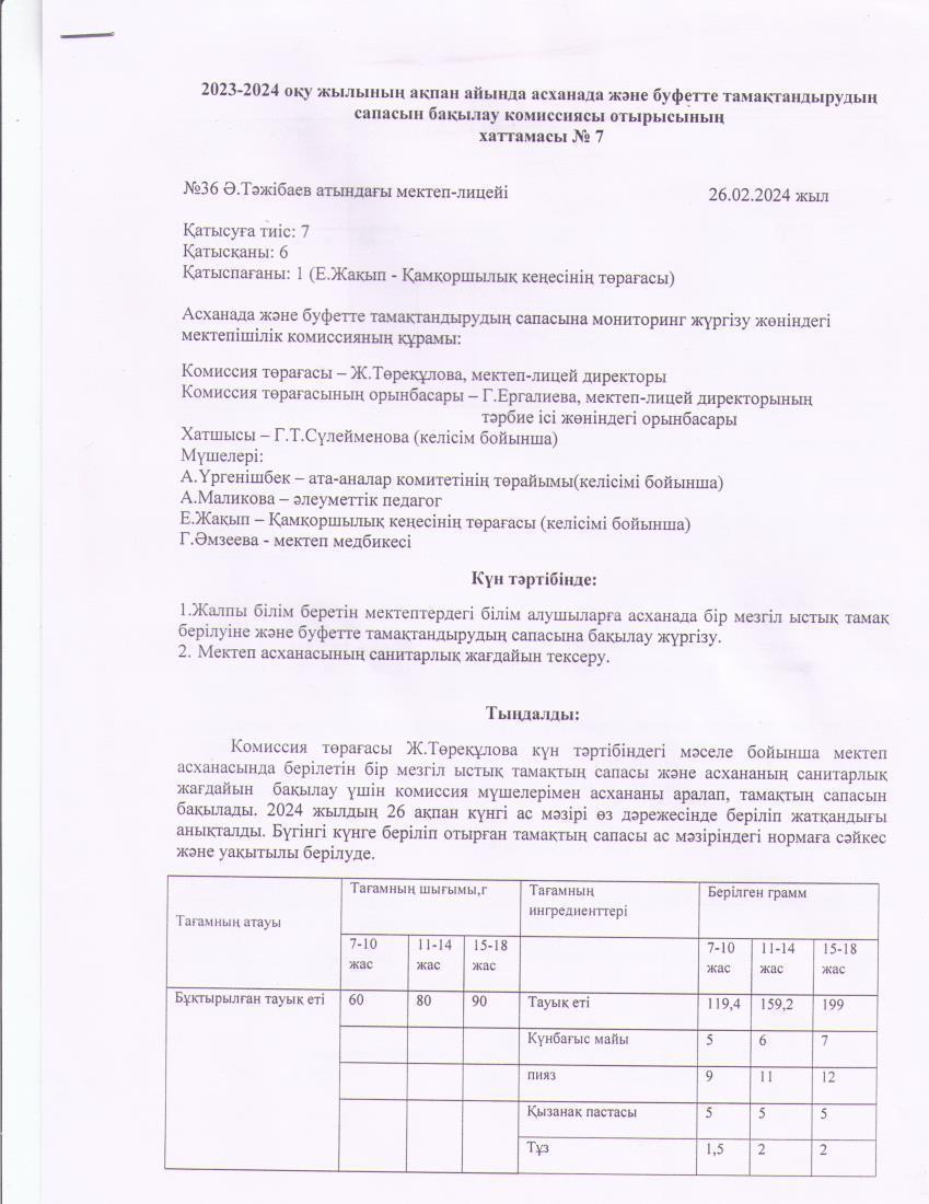 Оқушыларды тамақтандыру хаттамасы №7 26.02.2024 » №36 мектеп-лицей