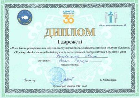 "Мың бала" республикалық мәдени-ағартушылық жобасы аясында өткізілген облыстық "Тіл мәртебесі - ел мерейі" байқауында жоғары нәтиже көрсетіп 10"б" сынып оқушысы Кочерещенко Юлия І дәрежелі дипломмен марапатталды.